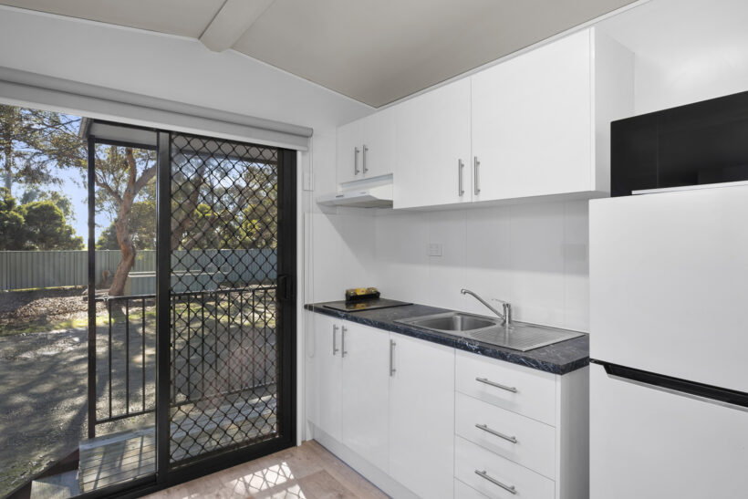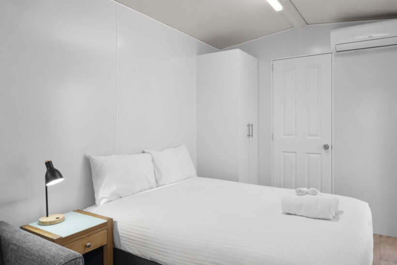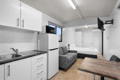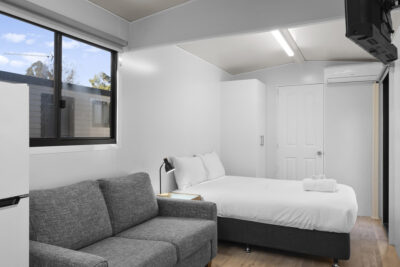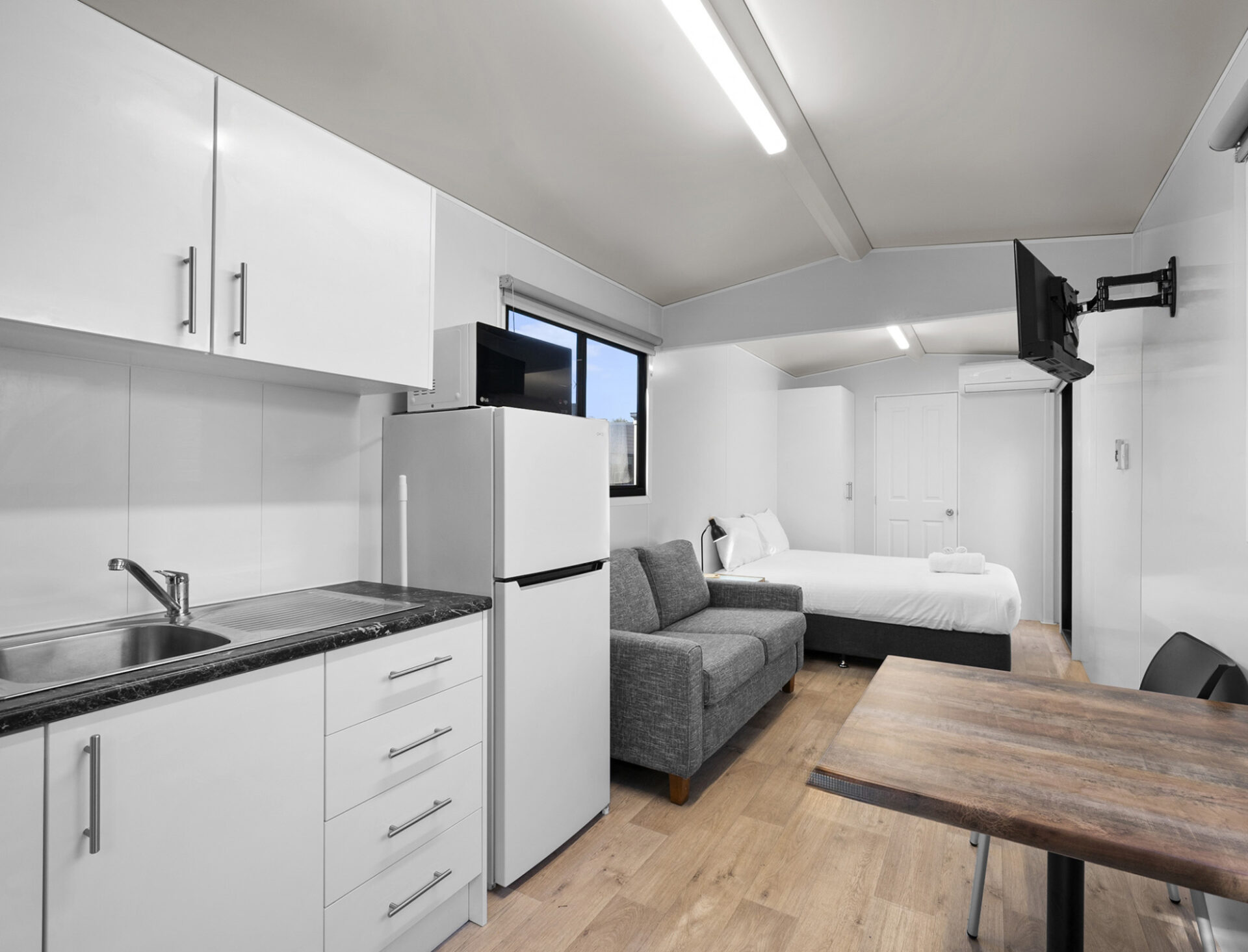 Perfect for couples or solo travellers, this modern studio features a double bed, private ensuite, and a comfortable living area. The kitchenette is equipped with a full-size fridge, microwave, and electric cooktop. Enjoy reverse cycle air conditioning and a private balcony for added relaxation.